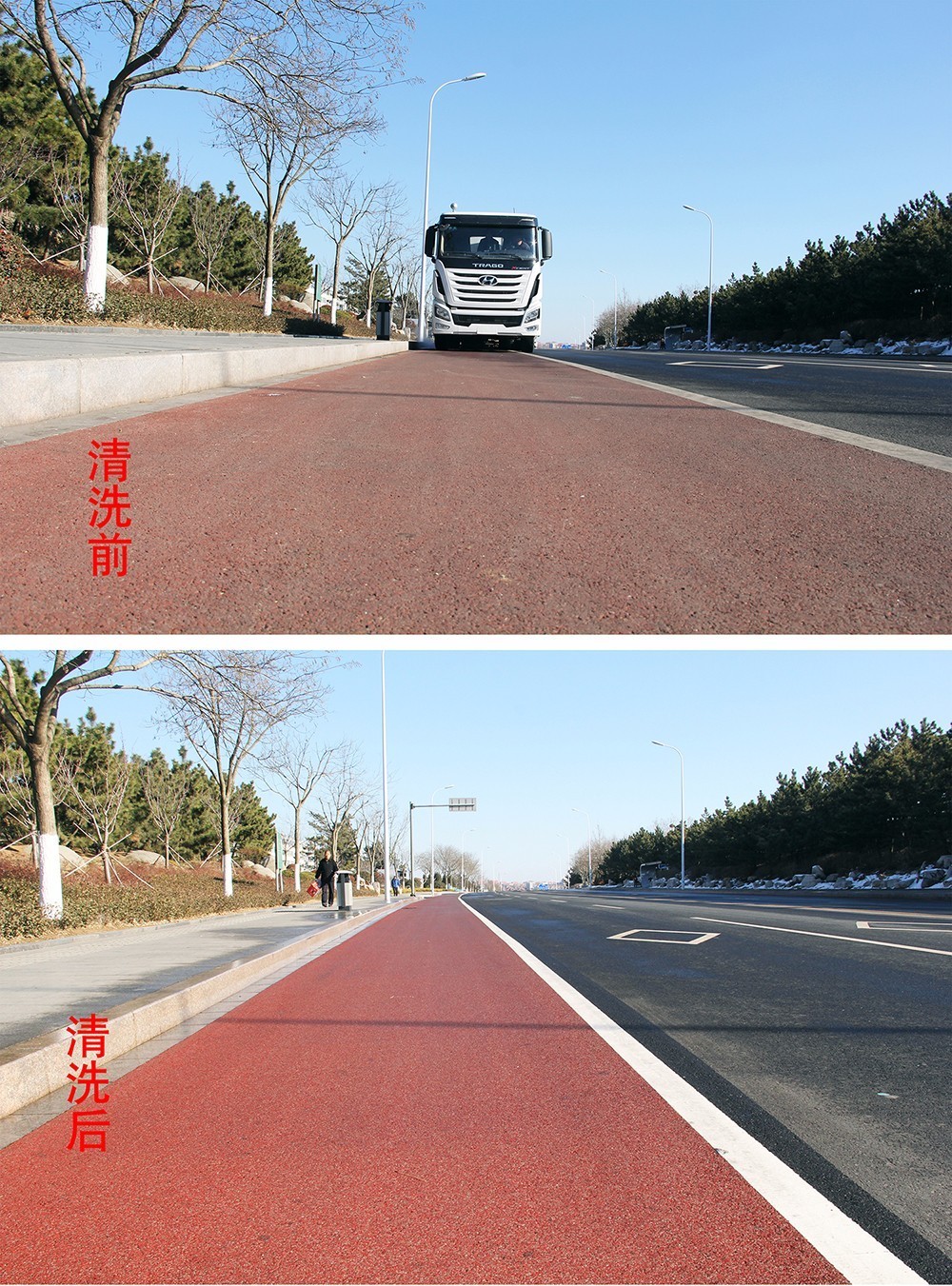 由它行駛之后的馬路,車后方的一條紅色瀝青路面凸顯,宛如剛剛鋪設(shè)完一樣嶄新道路,煥然一新,與兩側(cè)的車道形成鮮明對比,路面的透水縫隙、塑料顆粒清晰可見,路面白色標(biāo)識線像剛噴涂過一樣的潔白,干凈整潔,效果突出,真正達(dá)到“席地而坐”的標(biāo)準(zhǔn)。市民們紛紛拿出手機拍照,并感嘆“路面從來沒見過掃的這么干凈,跟新鋪的一樣”。